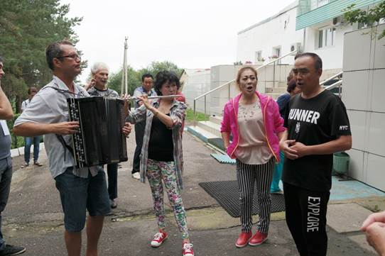 Пели и плясали везде! В холле, на крылечке, в парке! Китайские друзья солировали в песнях «Катюша», «Подмосковные вечера», «Ямщик». Их народные китайские инструменты вместе с баяном и гармошкой звучали гармонично экспромтом для любой русской народной песни, аккомпанируя нашим артистам.