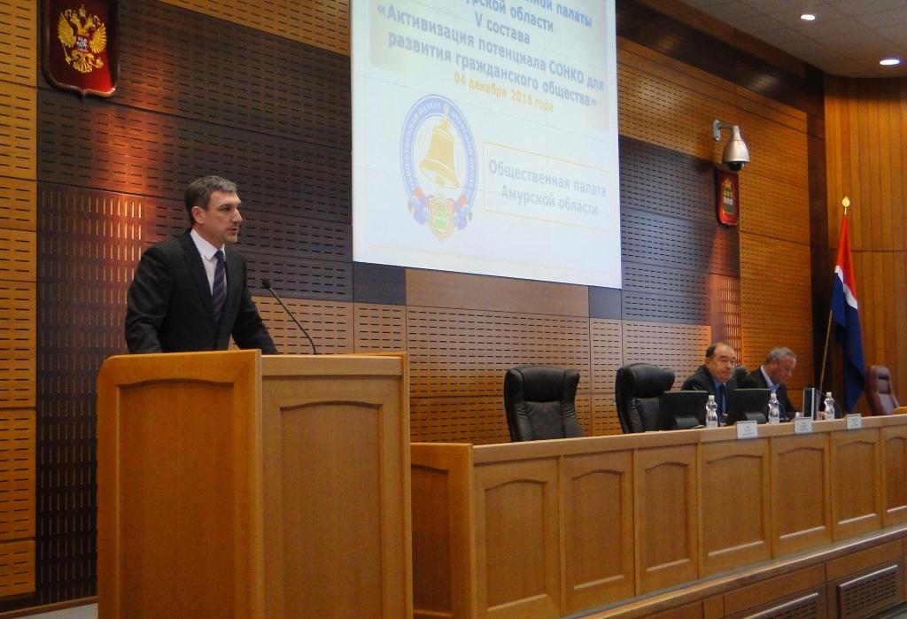 04 декабря 2018 года состоялось заседание Общественной палаты Амурской области по теме «Активизация потенциала СОНКО для развития гражданского общества». В заседании приняли участие губернатор Амурской области Орлов Василий Александрович, председатель комитета по социальной политики Законодательного Собрания Амурской области Рудь Андрей Анатольевич, представители органов исполнительной власти Амурской области, общественных советов при органах исполнительной власти Амурской области, НКО.