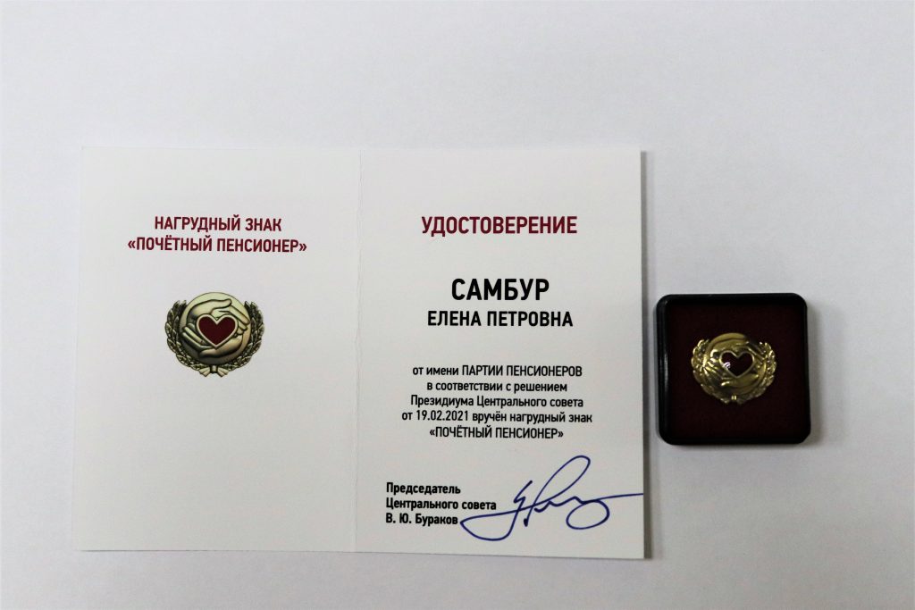 Председатель правления регионального отделения партии в Амурской области Александр Василенко по поручению Президиума партии вручил знак «Почетного пенсионера» Самбур Елене Петровне — председателю областного отделения «Союз пенсионеров России» за большую работу с ветеранами.
