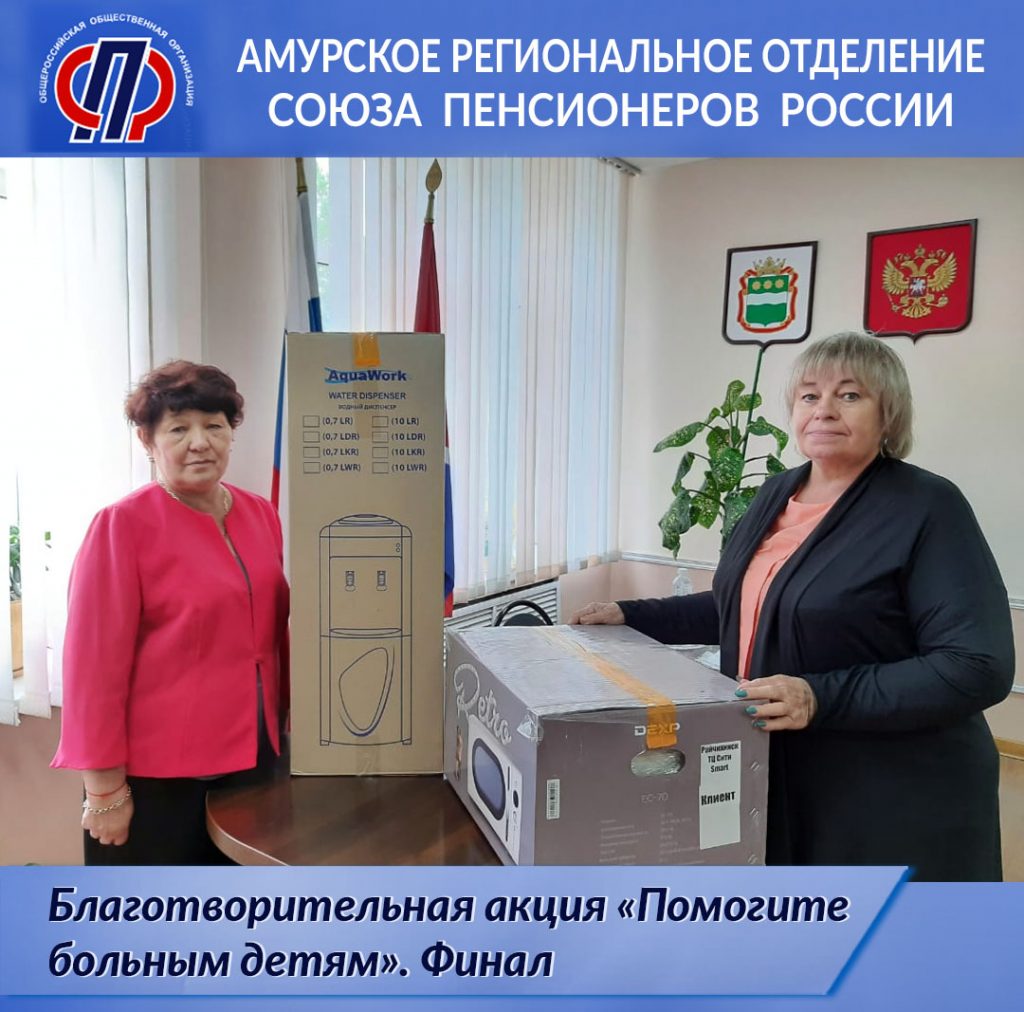21 сентября 2021 года члены местного отделения общественной организации «Союз пенсионеров России» (МО СПР) города Райчихинска в очередной раз вручили подарки детскому отделению Райчихинской городской больницы – микроволновую печь и кулер для воды.