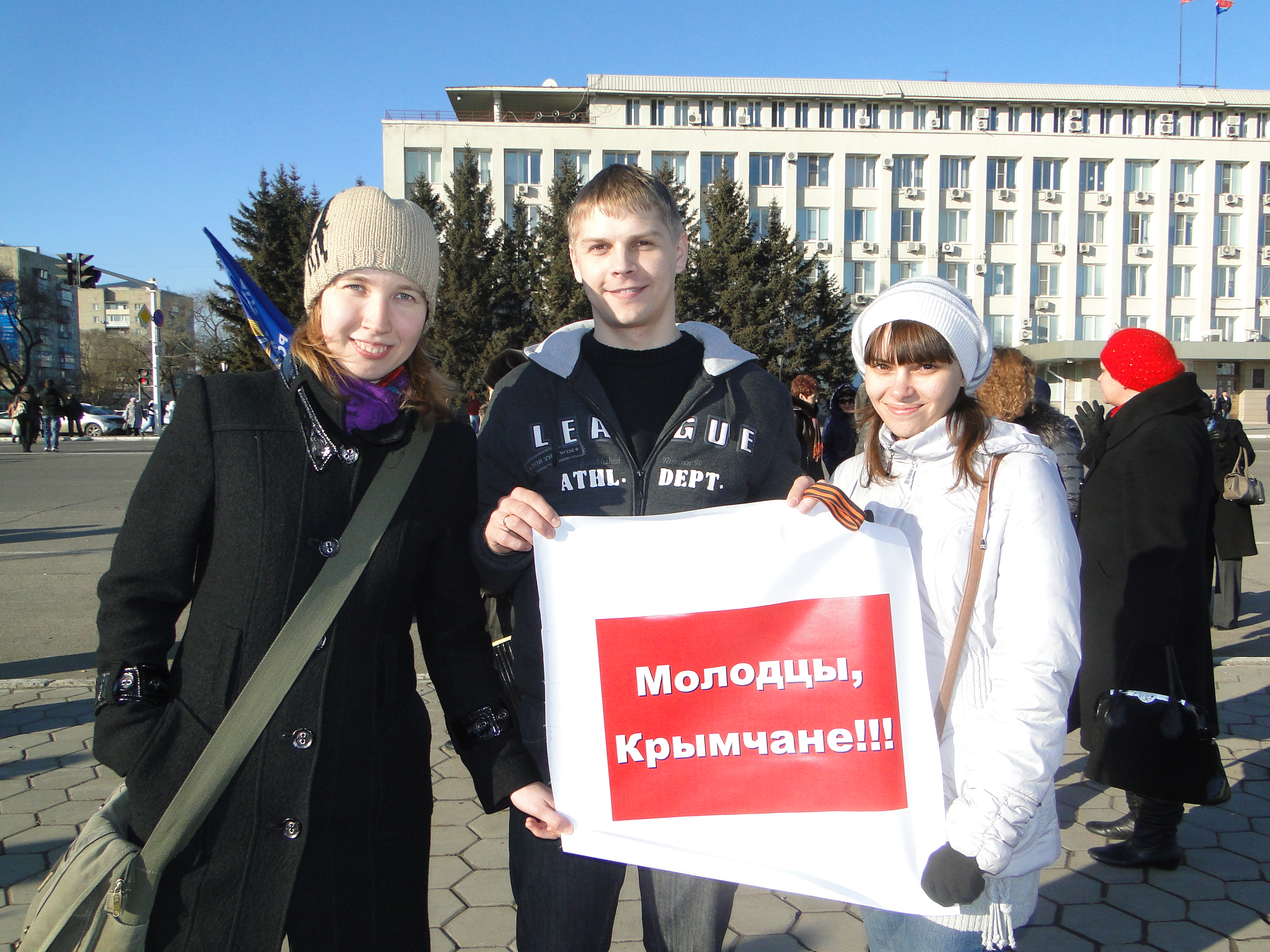 На референдуме, который состоялся в минувшее воскресенье, проголосовавшие крымчане почти единодушно высказали желание присоединиться к России. «Крым с нами», «Крым, мы с тобой», «Крым в обиду не дадим», «Одна страна – один народ», «Защитим себя сами», «Крым родной пришёл домой», «За мир на Украине», «Фашизм не пройдёт» – с такими плакатами в руках амурчане поддерживали результаты референдума.