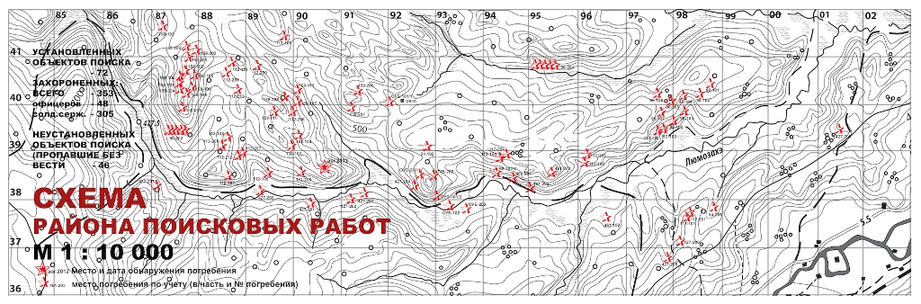 Всего в районе поиска документально установлено 72 объекта: плановые захоронения (кладбища, братские могилы и отдельные могилы), расположенные на площади около 32 кв.км., в которых в августе 1945 года было захоронено 353 военнослужащих, в том числе 48 офицеров и 305 рядовых и сержантов. В районе поиска могли находиться останки (в боевых захоронения) пропавших без вести в период с 13 по 16 августа 1945 года рядовых и сержантов различных частей дивизии — всего 45 человек. Итого в районе поиска могли быть останки (захоронения) 398 военнослужащих различных частей 190-й стрелковой дивизии. Документов, указывающих на перезахоронение останков погибших военнослужащих 190-й стрелковой дивизии на территорию Советского Союза и/или в иные места на территории Северо-Востока Китая, к настоящему времени не обнаружено.