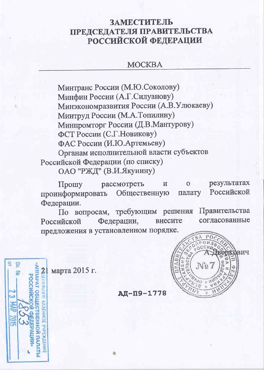 Пакет рекомендаций Общественной палаты Российской Федерации по итогам общественных слушаний на тему «Роль пригородного транспорта в социально-экономическом развитии субъектов Российской Федерации», состоявшихся 20 ноября 2014 года и направленный Председателю Правительства Российской Федерации Д.А. Медведеву, принят к рассмотрению.