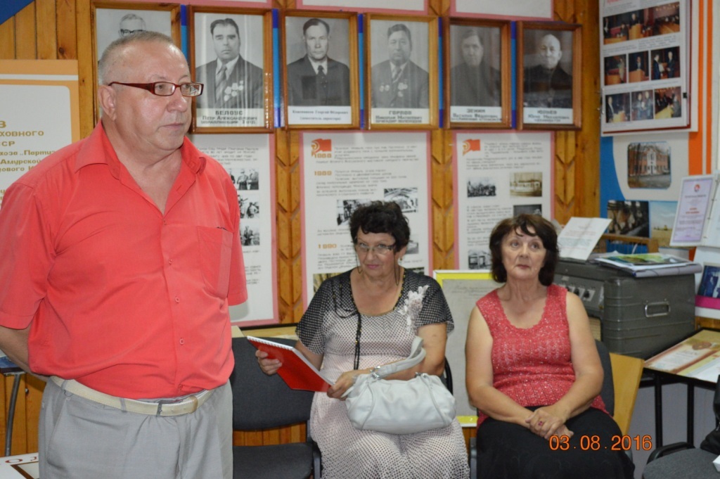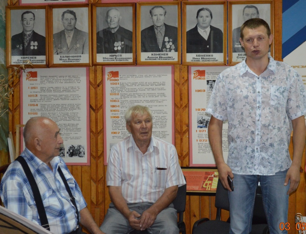 Щукин Иван Иванович рассказал 90 – летнюю историю района, а также и историю образования сёл Раздольное, Гильчин, становление совхоза Партизан. Хорохордин, Верисоцкая, Кузнецов, Ильяшик поделились с нами своими воспоминаниями о создании музея хозяйства, где хранится вся слава людей создающих и прославляющих своим трудом своё село, свою Родину, вписавших в историю страницы золотые. Как они работают со своими жителями, как воспитывают молодёжь на примере знаменитых и знатных работников хозяйства. Сколько всего собрано в этой маленькой комнате, с какой любовью всё это хранится, оформляется в большие книги, объёмные стенды, фотоальбомы. К этому причастны и наши хозяева, но в большей мере это заслуга очень талантливого во всём Евгения Ивановича Хорохордина.