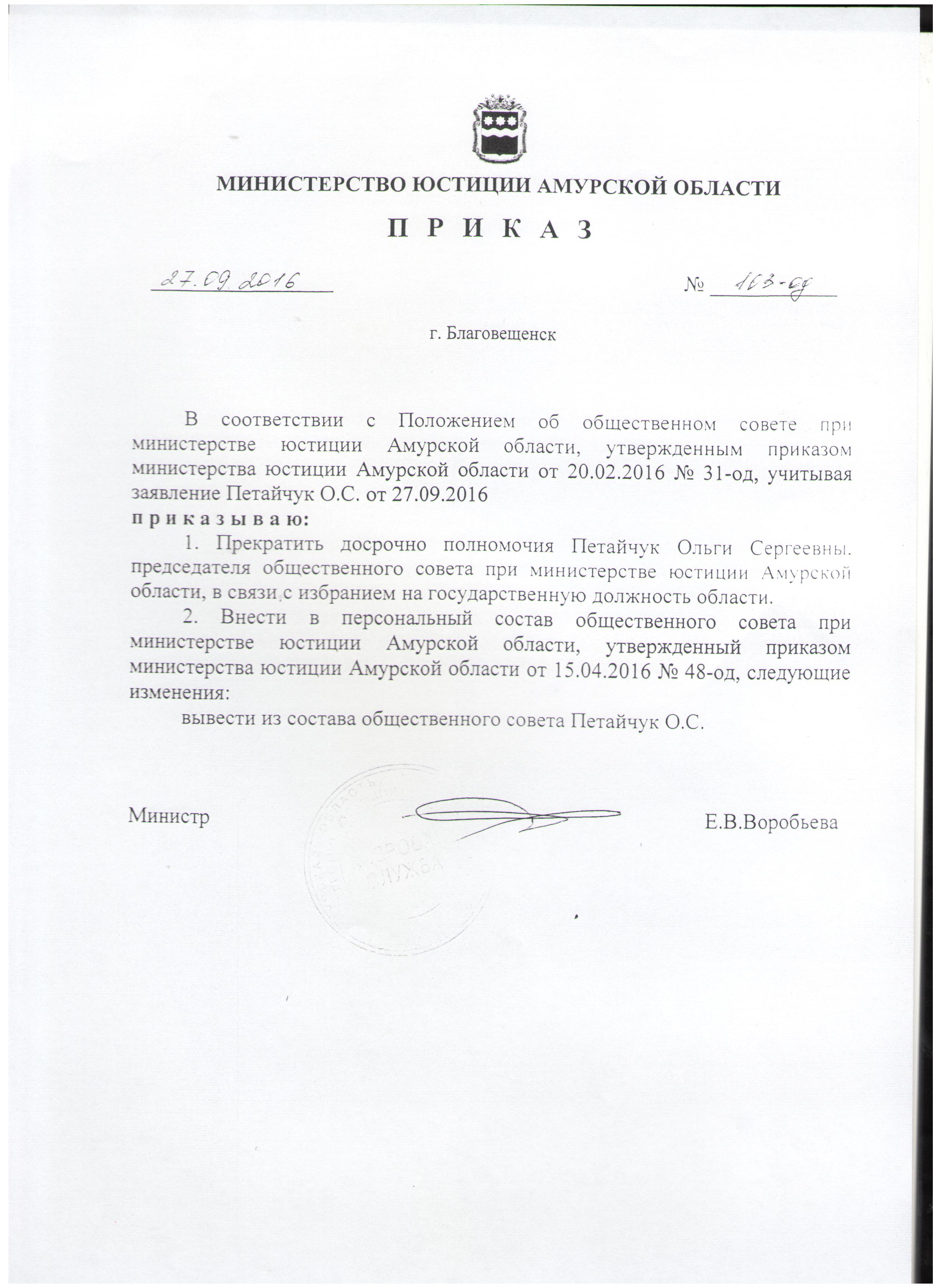 В соответствии с Федеральным законом от 21.06.2014 г. № 212-ФЗ «Об основах общественного контроля в Российской Федерации», Законом Амурской области от 29.12.2014 № 478-ОЗ «Об отдельных вопросах организации и осуществления общественного контроля на территории Амурской области» при министерстве юстиции Амурской области (далее – министерство) образован общественный совет. Положение об общественном совете при министерстве юстиции утверждено приказом министерства от 20.02.2016 № 31-од.